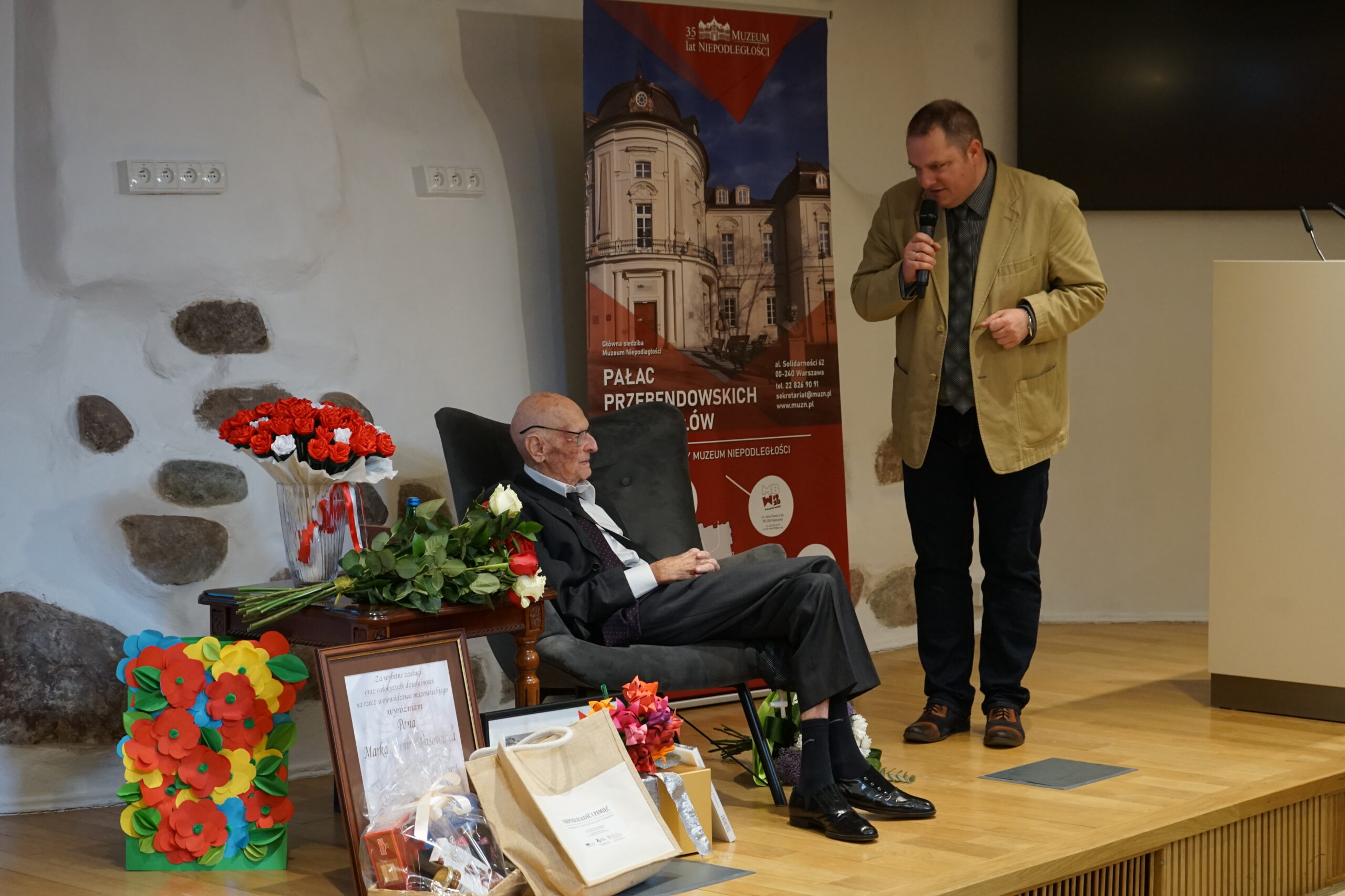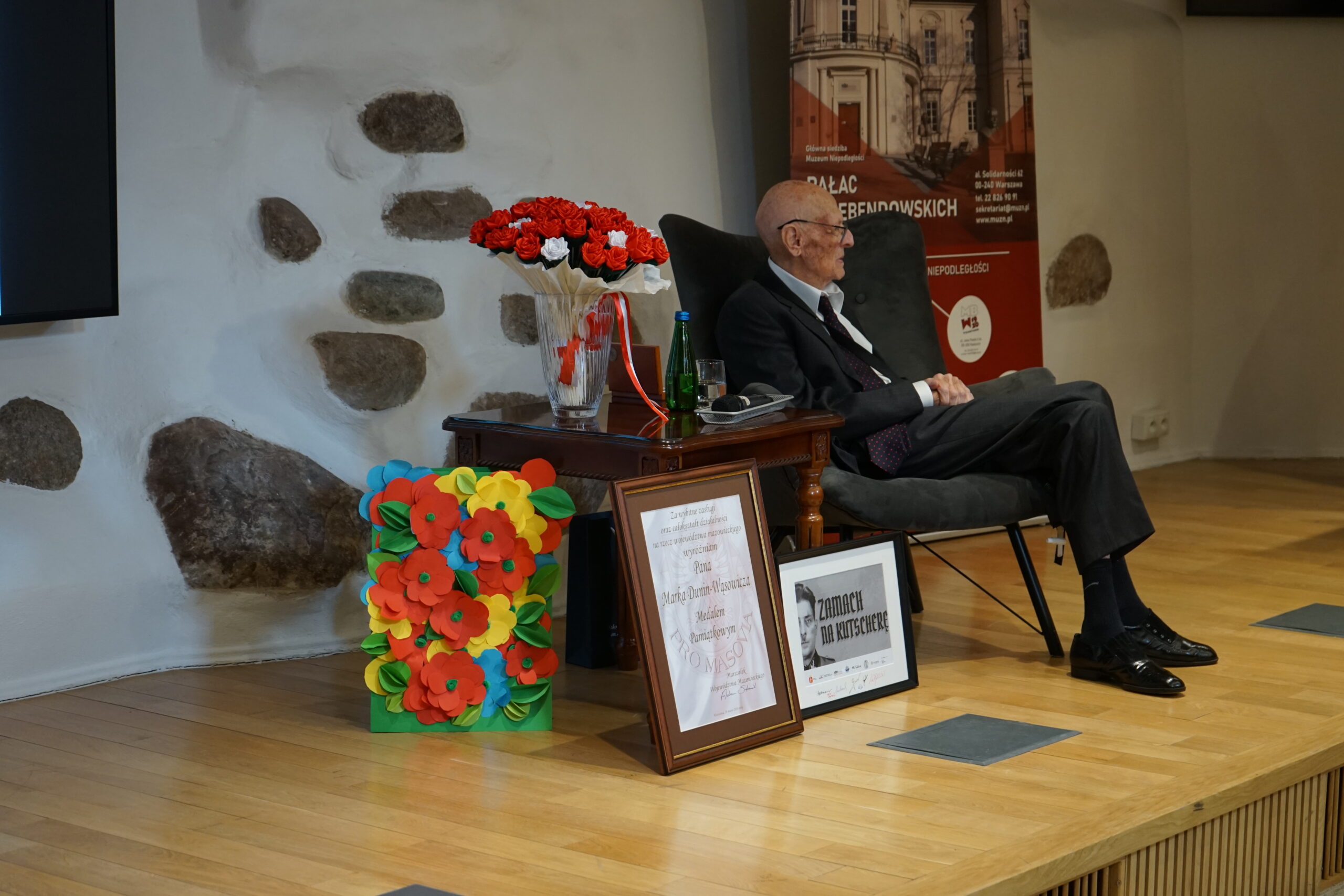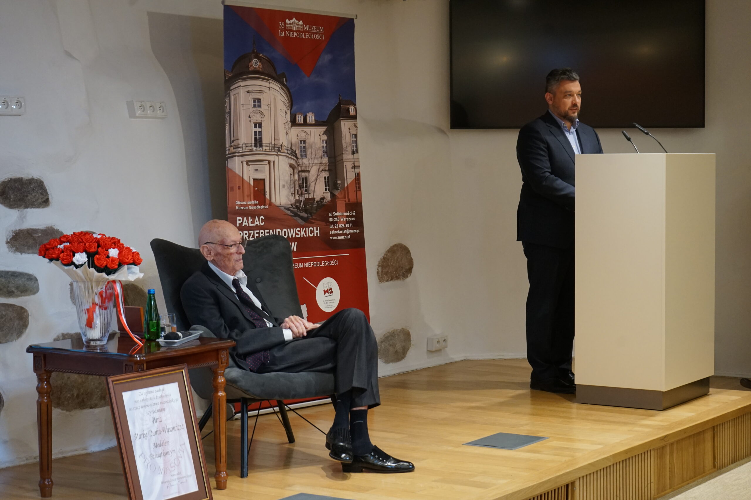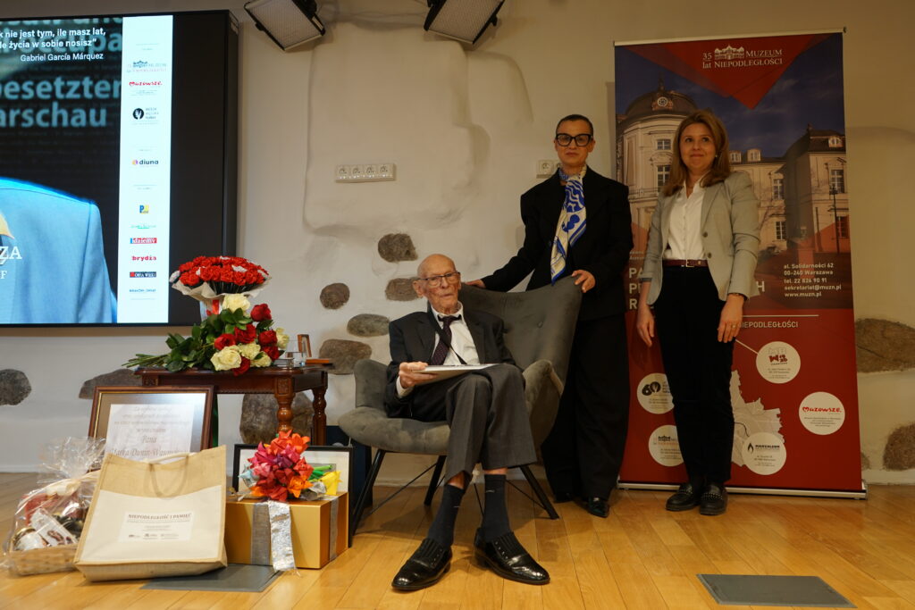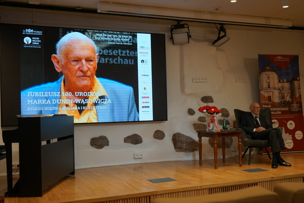 26 marca 2026 roku w Muzeum Niepodległości odbyło się wyjątkowe i niezwykle poruszające wydarzenie – jubileusz 100. rocznicy urodzin Marka Dunin-Wąsowicza, byłego więźnia Pawiaka oraz KL Stutthof. W spotkaniu uczestniczyła rodzina i przyjaciele p. Marka Dunin-Wąsowicza. Wśród gości byli również przedstawiciele władz samorządowych, instytucji kultury i nauki: Karolina Misiejko – rzecznik Funduszy Europejskich Urzędu Marszałkowskiego Województwa Mazowieckiego, Agnieszka Pawelec reprezentująca Prezydenta m.st. Warszawy Rafała Trzaskowskiego, Grzegorz Rogólski, radny Dzielnicy Śródmieście,  dr hab. Marcin Owsiński, dyrektor Muzeum KL Stutthof w Sztutowie, Beata Regulska, wicedyrektor Szkoły Podstawowej nr 210 im. Bohaterów Pawiaka wraz z uczniami oraz Elżbieta Kiedysz – wicedyrektor XL Liceum Ogólnokształcącego z Oddziałami Dwujęzycznymi im. Stefana Żeromskiego w Warszawie wraz z młodzieżą. Jubilata i gości przywitała dyrektor Muzeum Niepodległości Katarzyna Legawiec podkreślając niezwykłą biografię pana Marka i wkład w pamięć historyczną. Podczas uroczystości Pan Marek Dunin-Wąsowicz zostały odznaczony medalem pamiątkowym Pro Masovia przyznanym przez Marszałka Województwa Mazowieckiego Adama Struzika. Szczególnym momentem jubileuszu było wręczenie laurek i kwiatów wykonanych przez młodzież z warszawskich szkół. Uroczystość zakończył występ przygotowany przez Fundację Art. w wykonaniu sopranistki Aleksandry Okrasy przy akompaniamencie  Włodzimierza Trzeciaka.