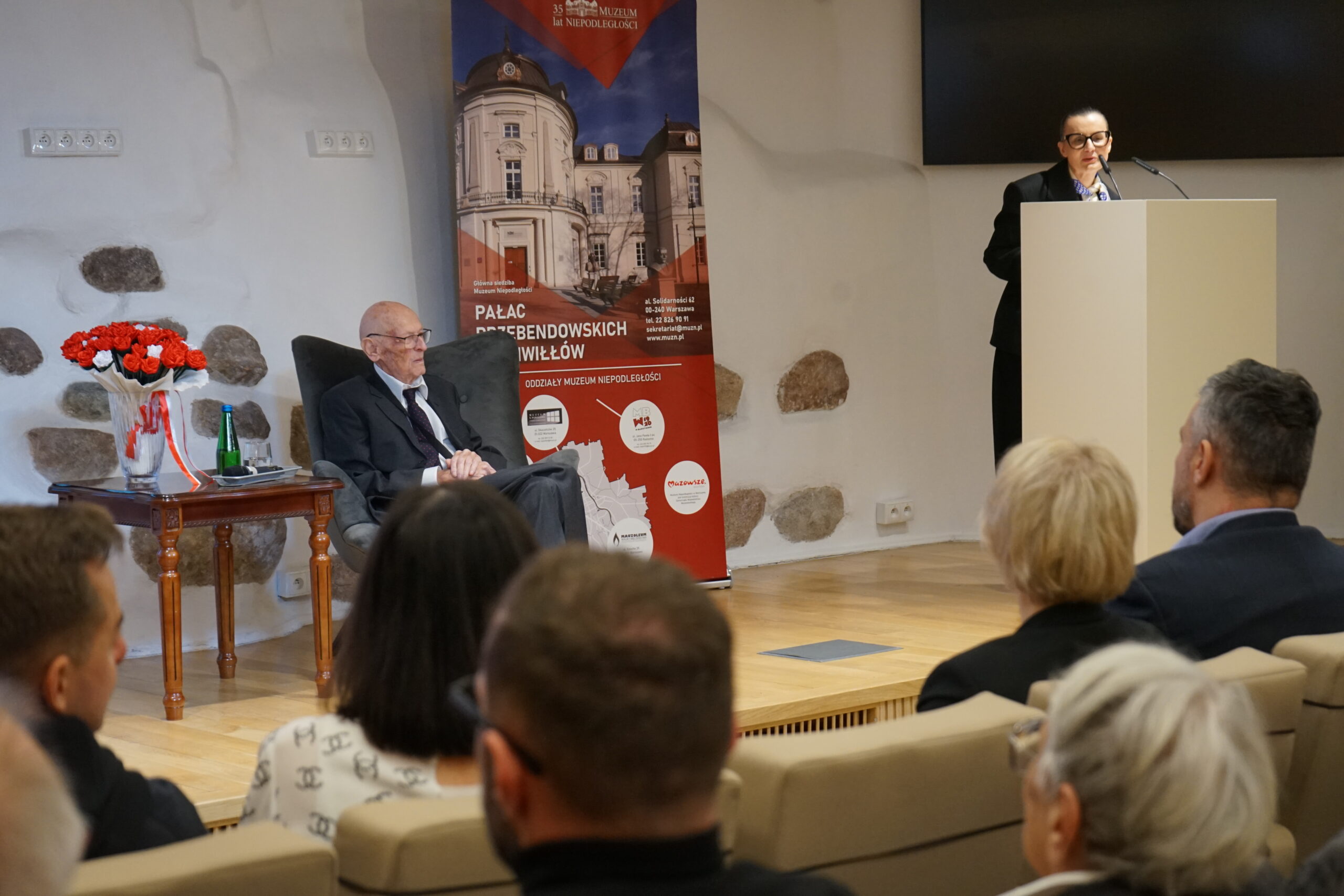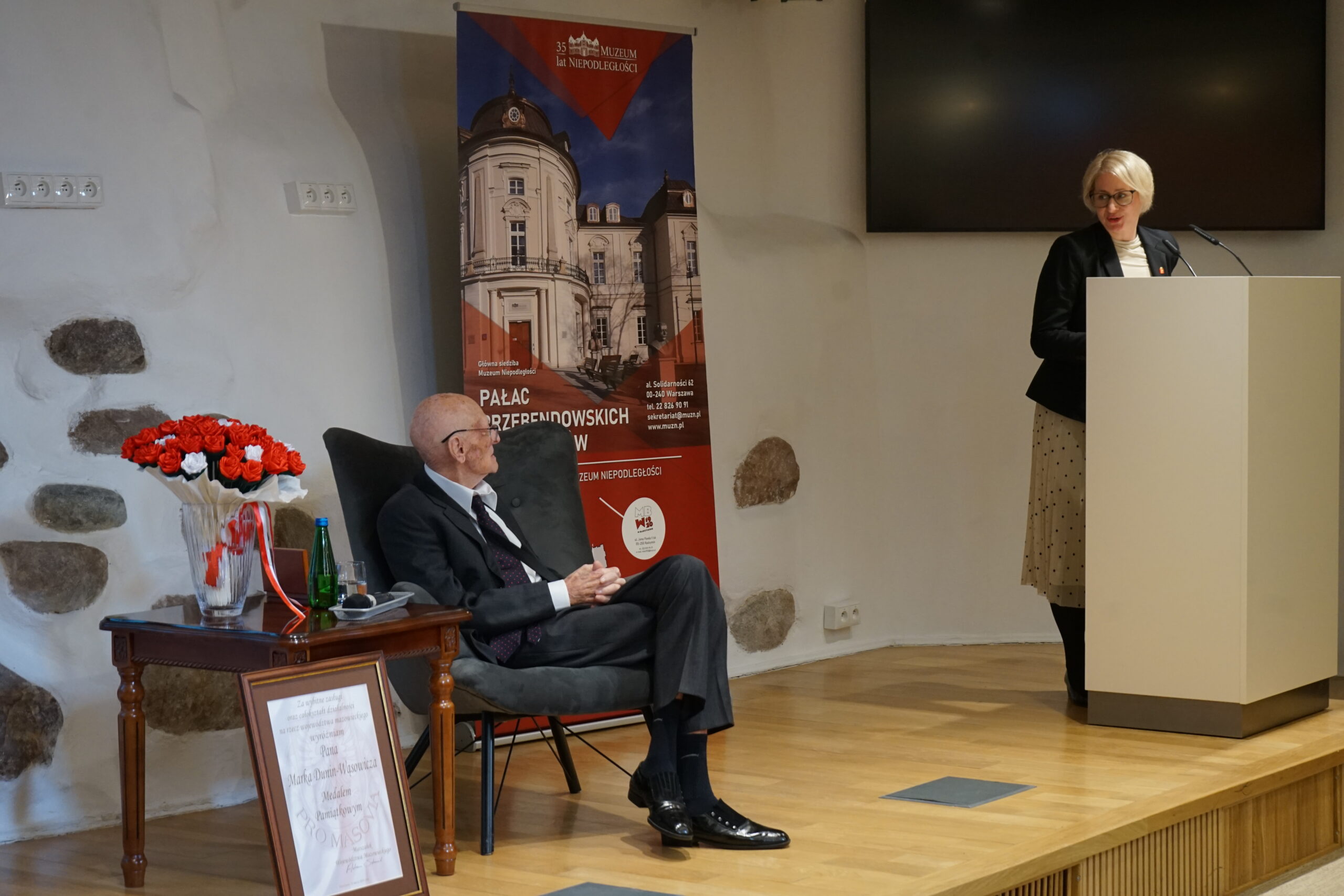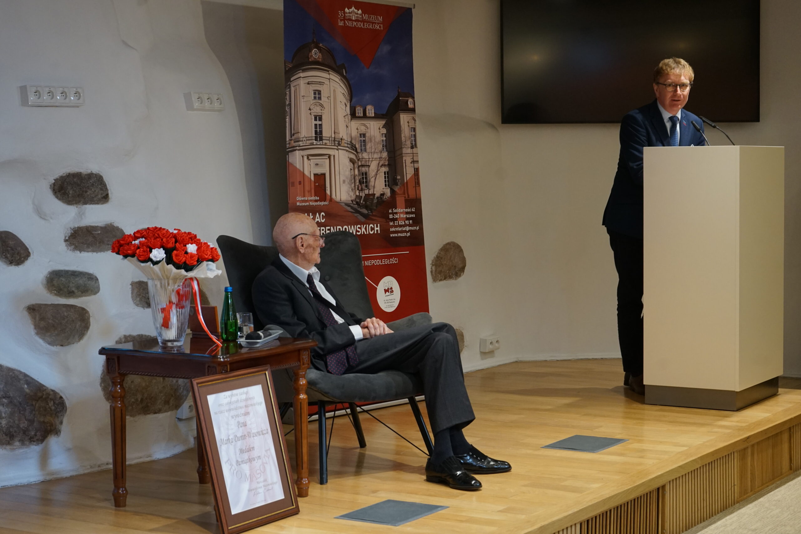26 marca 2026 roku w Muzeum Niepodległości odbyło się wyjątkowe i niezwykle poruszające wydarzenie – jubileusz 100. rocznicy urodzin Marka Dunin-Wąsowicza, byłego więźnia Pawiaka oraz KL Stutthof. W spotkaniu uczestniczyła rodzina i przyjaciele p. Marka Dunin-Wąsowicza. Wśród gości byli również przedstawiciele władz samorządowych, instytucji kultury i nauki: Karolina Misiejko – rzecznik Funduszy Europejskich Urzędu Marszałkowskiego Województwa Mazowieckiego, Agnieszka Pawelec reprezentująca Prezydenta m.st. Warszawy Rafała Trzaskowskiego, Grzegorz Rogólski, radny Dzielnicy Śródmieście,  dr hab. Marcin Owsiński, dyrektor Muzeum KL Stutthof w Sztutowie, Beata Regulska, wicedyrektor Szkoły Podstawowej nr 210 im. Bohaterów Pawiaka wraz z uczniami oraz Elżbieta Kiedysz – wicedyrektor XL Liceum Ogólnokształcącego z Oddziałami Dwujęzycznymi im. Stefana Żeromskiego w Warszawie wraz z młodzieżą. Jubilata i gości przywitała dyrektor Muzeum Niepodległości Katarzyna Legawiec podkreślając niezwykłą biografię pana Marka i wkład w pamięć historyczną. Podczas uroczystości Pan Marek Dunin-Wąsowicz zostały odznaczony medalem pamiątkowym Pro Masovia przyznanym przez Marszałka Województwa Mazowieckiego Adama Struzika. Szczególnym momentem jubileuszu było wręczenie laurek i kwiatów wykonanych przez młodzież z warszawskich szkół. Uroczystość zakończył występ przygotowany przez Fundację Art. w wykonaniu sopranistki Aleksandry Okrasy przy akompaniamencie  Włodzimierza Trzeciaka.