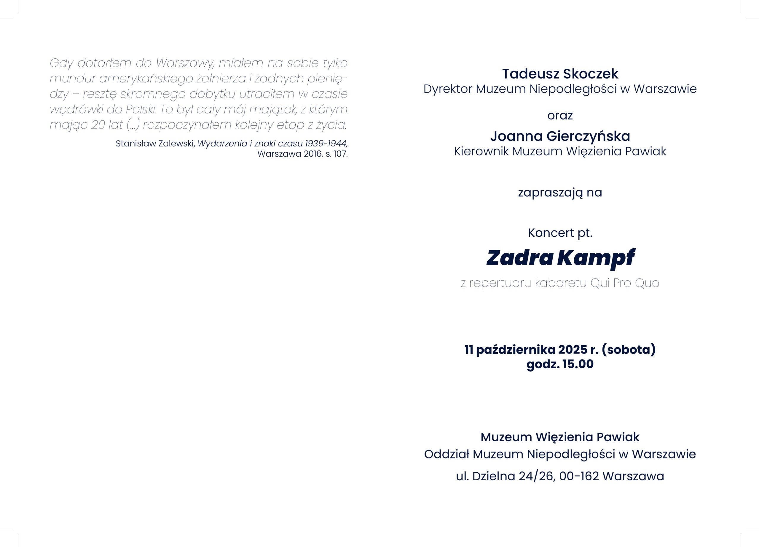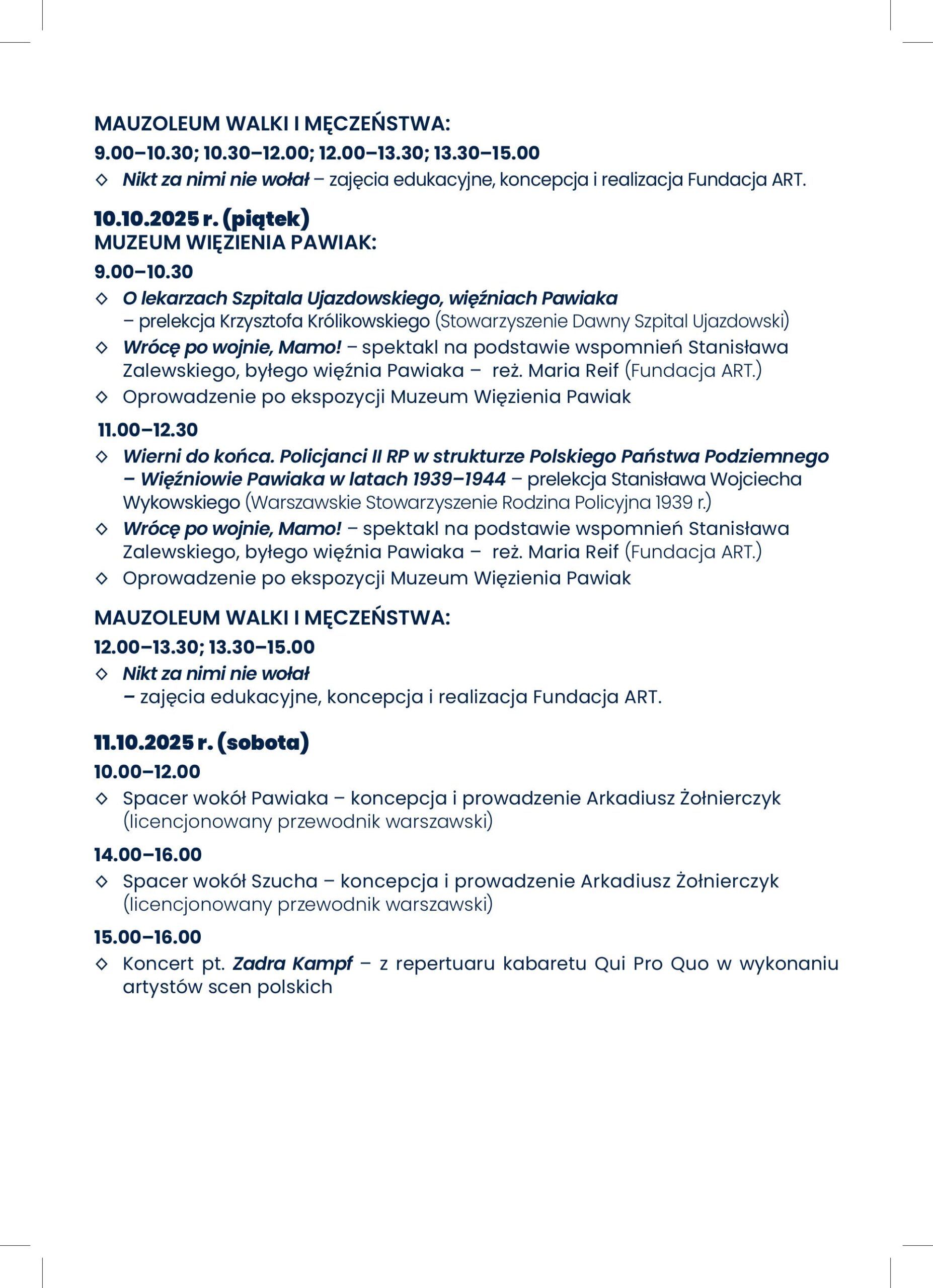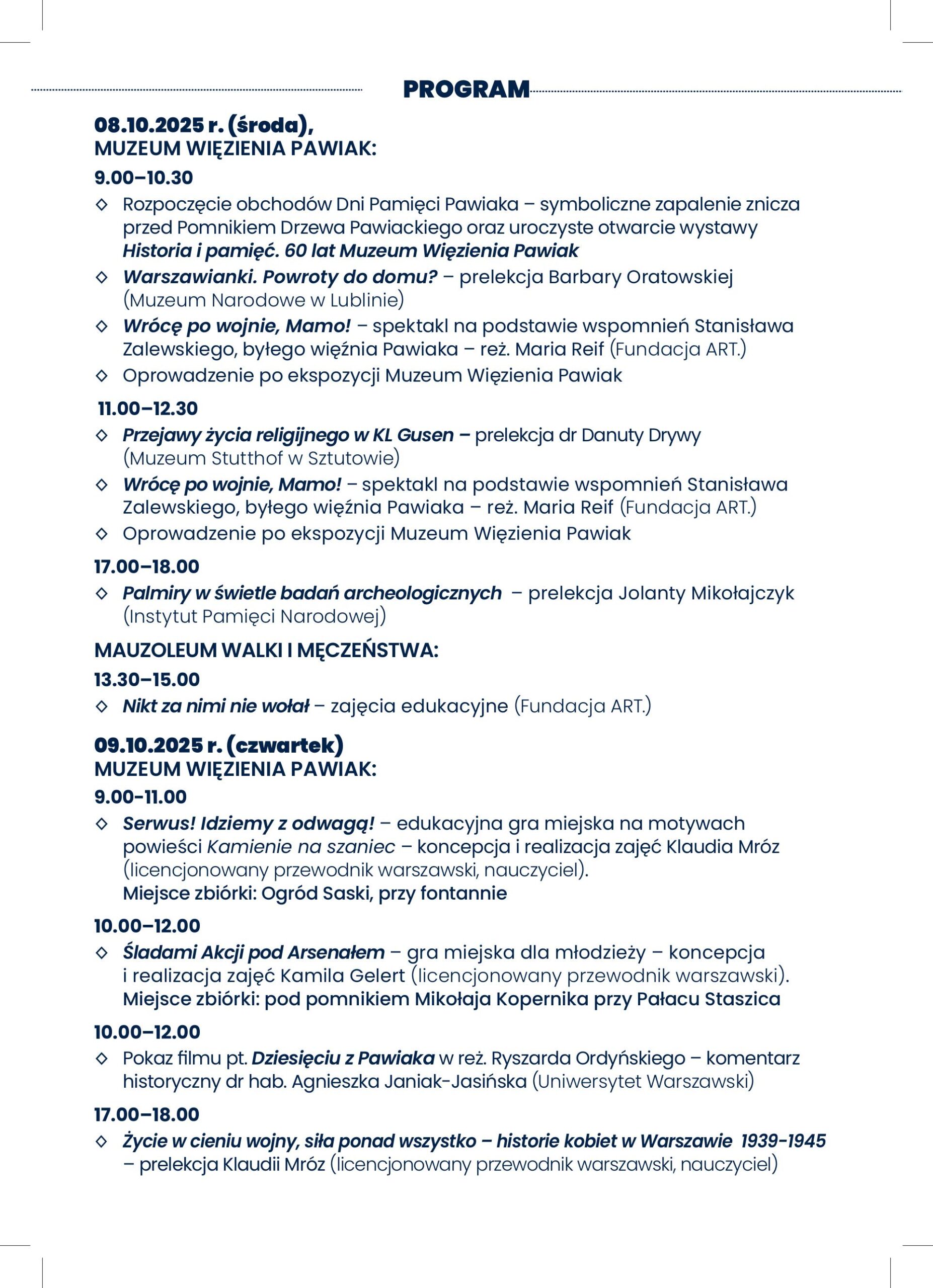 Podczas tegorocznej edycji Dni Pamięci Pawiaka zaplanowano prelekcje edukacyjne dla młodzieży upamiętniające 80. rocznicę zakończenia II wojny światowej. Dodatkowo w programie czeka na naszych gości zwiedzanie ekspozycji, spacer historyczny, pokaz filmu „Dziesięciu z Pawiaka”, spektakl „Wrócę po wojnie, Mamo!”, a na zakończenie koncert pt. Zadra Kampf z repertuaru kabaretu Qui Pro Quo w wykonaniu artystów scen polskich. To tylko kilka wydarzeń zaplanowanych od 8 do 11 października 2025 r. Więcej informacji znajdziecie państwo w programie.
